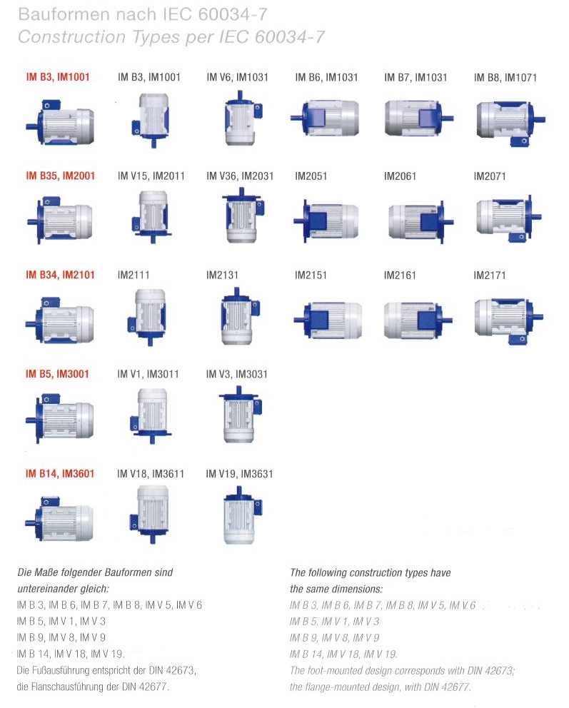 Bauformen werden mit einem international genormten IM-Code gekennzeichnet. IM steht für International-Mounting. Dieser Code berücksichtigt die Lage der Motorwelle, die Art des Lagerschilds, die Befestigung des Antriebs, die Ausführung der Antriebswelle und die Aufstellung des Motors.
